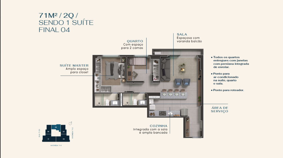 À venda, unidade no residencial Magno, localizado na Avenida T-8, Setor Bueno. Apartamento com 70 m², 2 quartos sendo 1 suíte. Condomínio com lazer completo, incluindo academia assinada pela Flex, quadra de areia, sala de podcasts, brinquedoteca, piscina adulto e infantil, sauna, salão de festas, espaço gourmet, entre outros diferenciais.