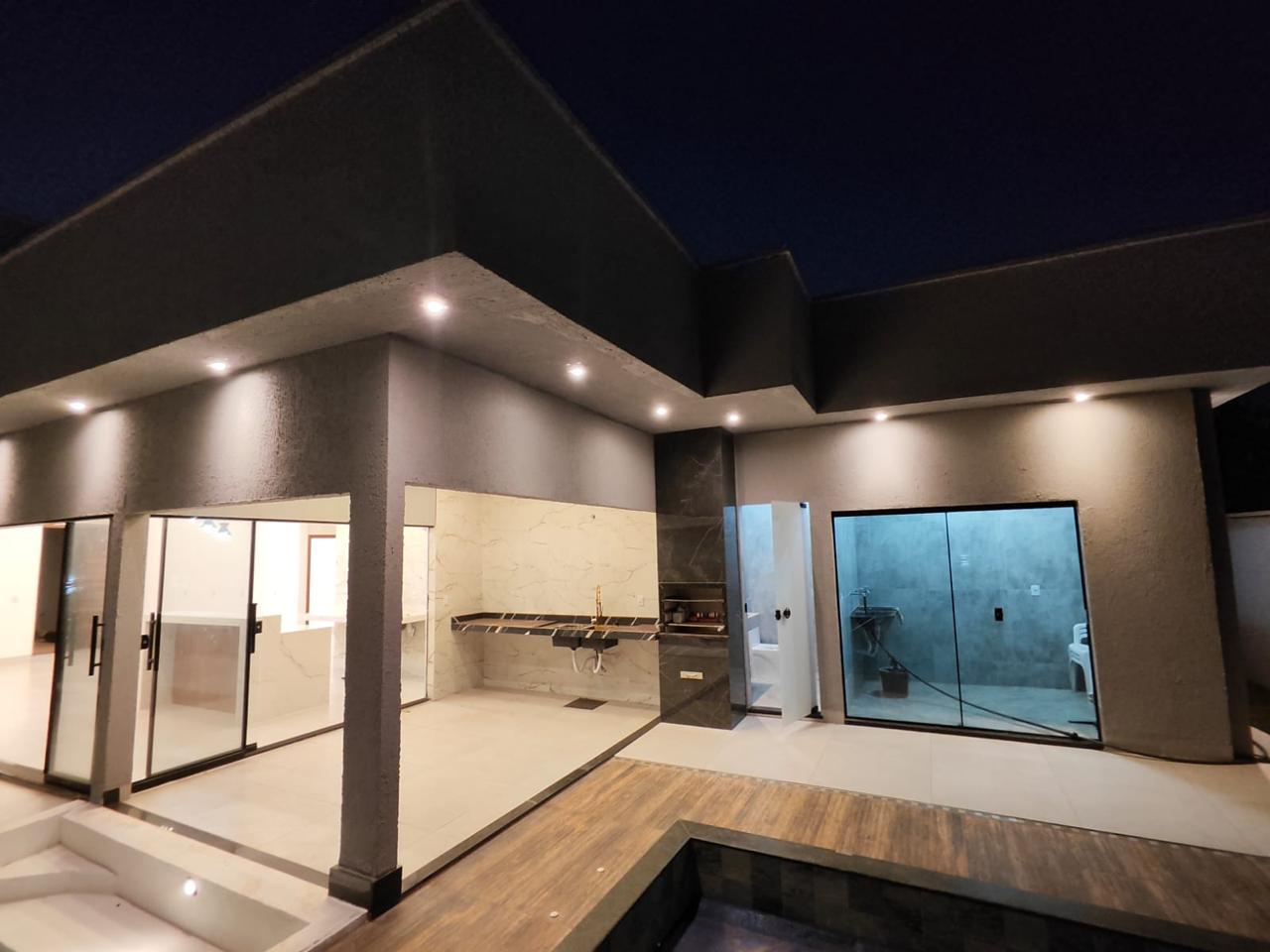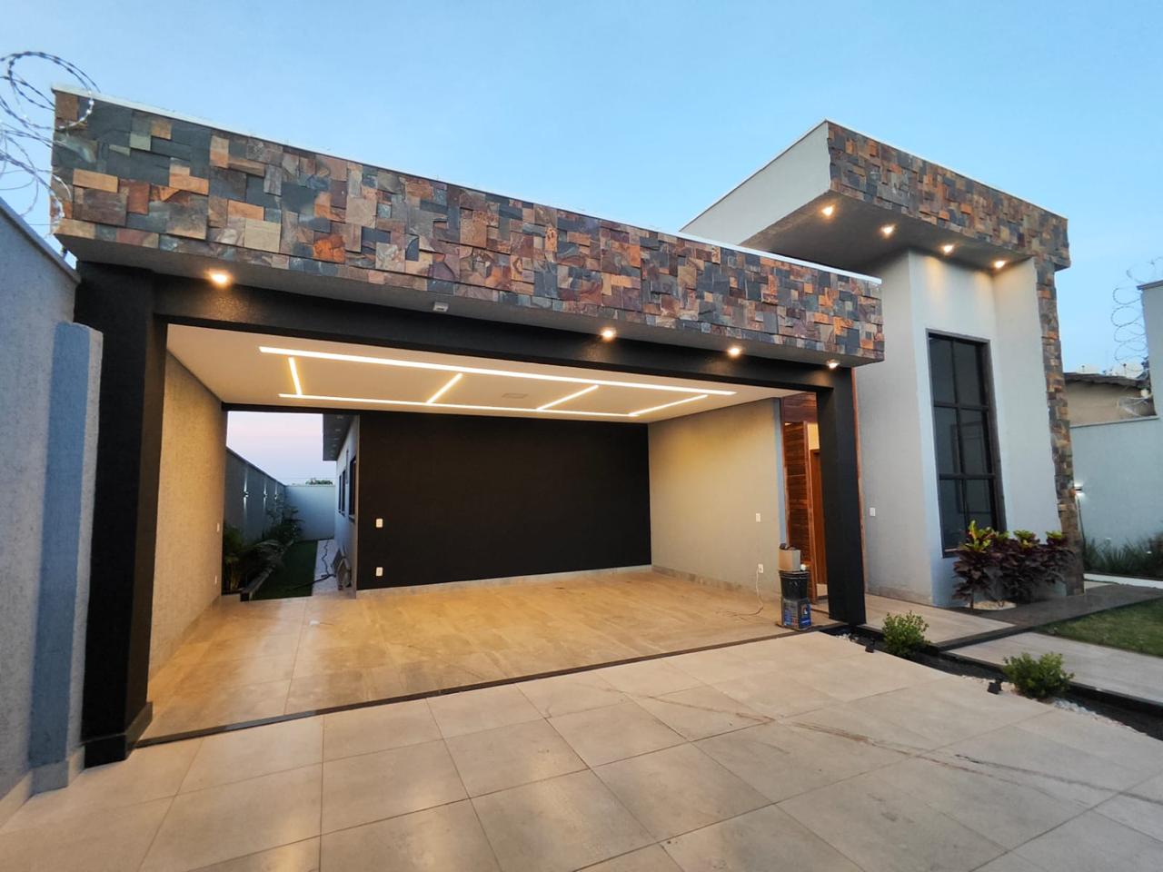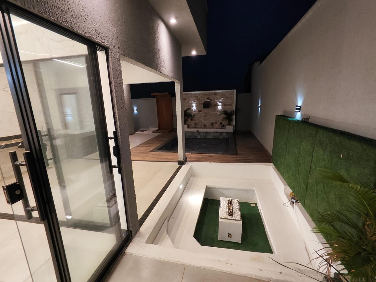 À venda casa térrea de alto padrão, 3 quartos, sendo 1 suíte master, com aprox. 210 m² de área construída, em lote de 360 m², no Buriti Sereno – Aparecida de Goiânia. Imóvel isolado no lote, com ambientes amplos, modernos e integrados, incluindo sala de TV, jantar, cozinha e área gourmet, além de escritório, lavabo e área de serviço. Suíte master com cuba dupla e dois chuveiros de teto com aquecimento solar, pé-direito duplo e iluminação em LED. Área de lazer completa com piscina com cascata, hidromassagem, aquecimento solar e iluminação em LED, lounge externo com lareira e paisagismo. Conta ainda com garagem para 4 veículos, sendo 2 cobertos, acabamento em porcelanato, rodapé embutido e fachada moderna com pedra ferro e porta pivotante em madeira. Imóvel que une design, conforto e exclusividade.
