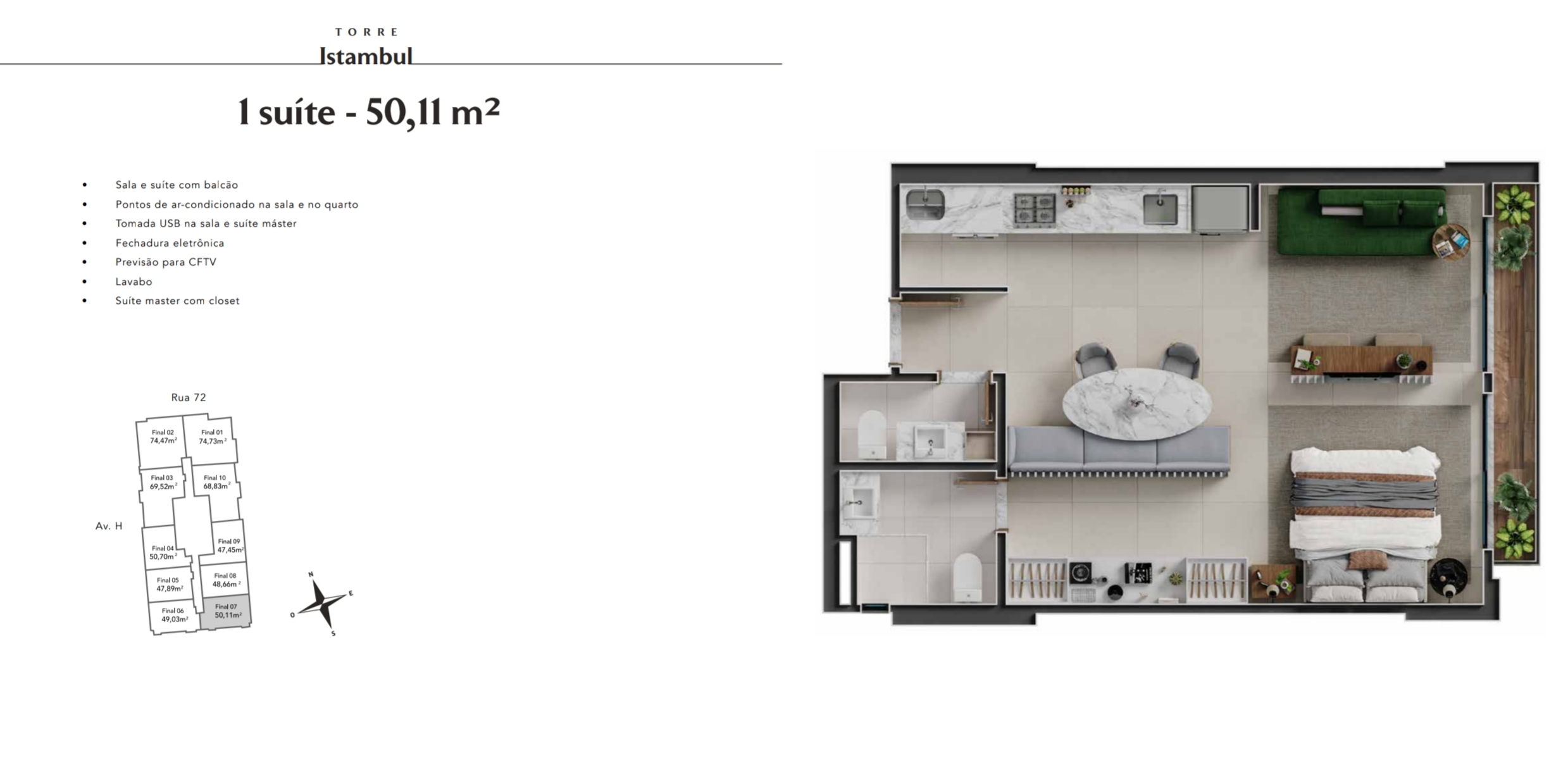 À venda apartamento 1 suíte, sala com varanda balcão, lavabo, na Torre Istambul, Unidade 1506, do Emirates Parque Flamboyant – Terral. Imóvel com fechadura eletrônica, pontos de ar-condicionado na sala e suíte, tomadas USB, previsão para CFTV e acabamentos de alto padrão, incluindo porcelanato acetinado 80×80, bancadas em granito Preto São Gabriel, banheiros e lavabo em mármore Branco Moura, forro de gesso e esquadrias em alumínio anodizado preto. Condomínio com lazer completo em conceito resort, oferecendo wellness com piscina coberta, spa, ofurô e sauna, complexo aquático com piscina adulto de borda infinita, infantil e spas, rooftop no 30º pavimento com piscina Red Pool e vista 180°, academia indoor e outdoor com pista de corrida, salão de festas, espaço gourmet, pub, churrasqueira, coworking, lounges, espaço infantil, pet place e lago de carpas.