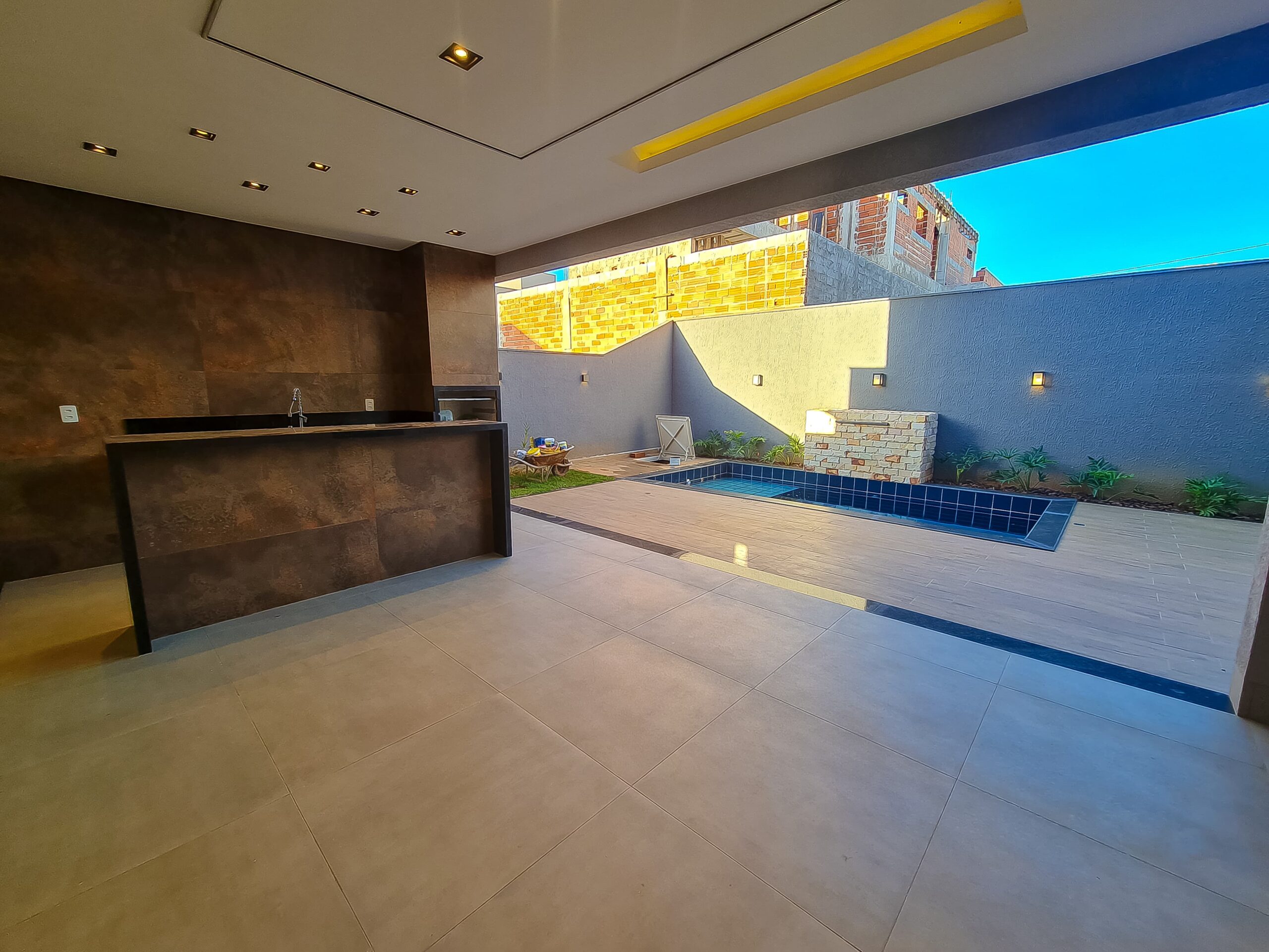 À venda sobrado com 3 suítes, 5 banheiros, 2 vagas de garagem e 228 m² de área construída, em lote de 275 m². No pavimento superior, conta com 3 suítes plenas, sendo a master com banheira, closet e varanda, além de duas suítes de solteiro também com varanda. No pavimento inferior, há escritório (ou 4º quarto), sala para 2 ambientes com pé-direito duplo integrada à cozinha, espaço gourmet com churrasqueira, despensa, área de serviço privativa e lavabo. Acabamento fino, com porcelanato 83×83, iluminação completa em LED, banheiros montados com nichos em granito e esquadrias em alumínio. Possui paisagismo completo e preparação para aquecimento solar em chuveiros, pias e cozinha. A área de lazer é exclusiva, com piscina preparada para aquecimento, hidromassagem, cascata, iluminação em LED, ducha fria e banheiro externo com chuveiro.