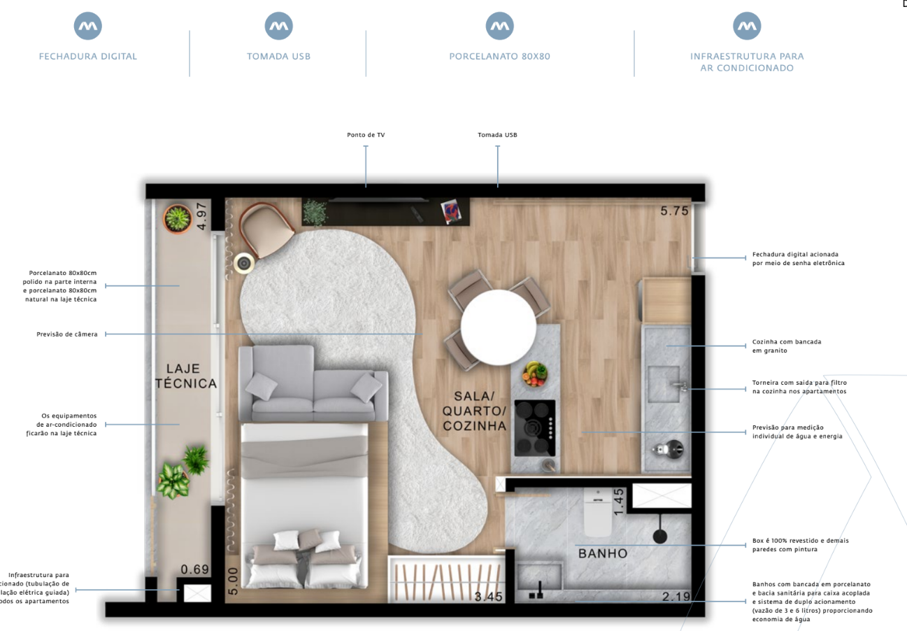 À venda studio de 32 m² no Metropolitan Bueno, localizado no Alto do Setor Bueno, entre as ruas T-36, S-1, T-65 e T-13, ao lado do Empório Saccaria, entre os parques Areião, Vaca Brava e o Jardim Botânico. Entrada de R$ 170.000,00 e saldo devedor de R$ 248.144,20, totalizando R$ 418.144,20. O imóvel possui quarto e cozinha integrados, além de laje técnica tipo varanda compacta. Conta com tomadas USB na área íntima, fechadura digital e estrutura de segurança completa. O Metropolitan Bueno é um complexo moderno com 6 torres, sendo 3 residenciais e 3 comerciais, a apenas 450 m do Buena Vista Shopping. Com conceito que une business e lifestyle, segue o sucesso do Metropolitan do Jardim Goiás, referência em valorização imobiliária no Centro-Oeste.